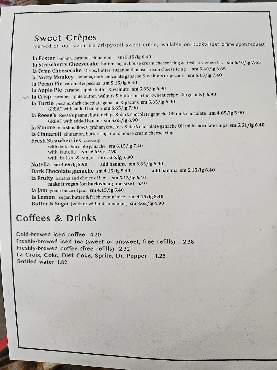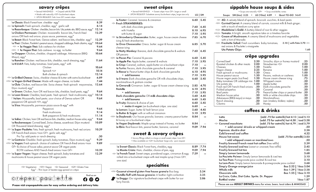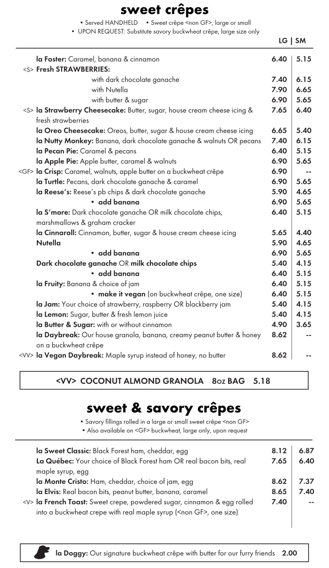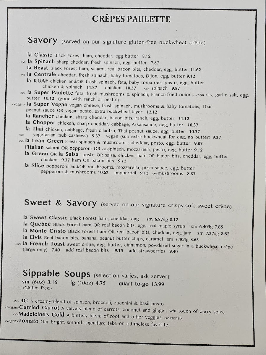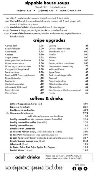 Overall, the menu at Crêpes Paulette offers a charming and diverse selection that balances both indulgence and creativity, even without listed prices. The savory options like la Classic, la Spinach, la Razorback, la Chicken Parmesan, and la Beast provide hearty, satisfying choices, while the sweet side shines with treats such as la Foster, Fresh STRAWBERRIES with dark chocolate ganache, Fresh STRAWBERRIES with Nutella, Fresh STRAWBERRIES with butter & sugar, and la Strawberry Cheesecake, each promising a delightful dessert experience. The fusion of flavors continues with the sweet & savory crêpes like la Sweet Classic, la Monte Cristo, and la French Toast, which add a playful twist to traditional offerings. Beyond crêpes, specialties like Coconut almond gluten-free house granola, Nutella fluff with house granola, and even la Doggy round out the menu with unique flair. Complementing everything are comforting sippable soups and sides such as 4G, Curried Carrot, Madeleine's Gold, Tomato, and Cream of Mushroom, making the overall menu feel thoughtfully curated and appealing for a wide range of tastes.