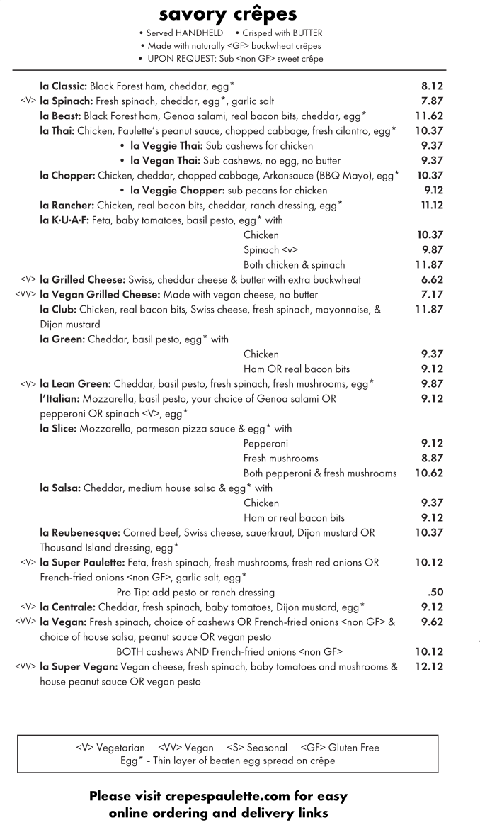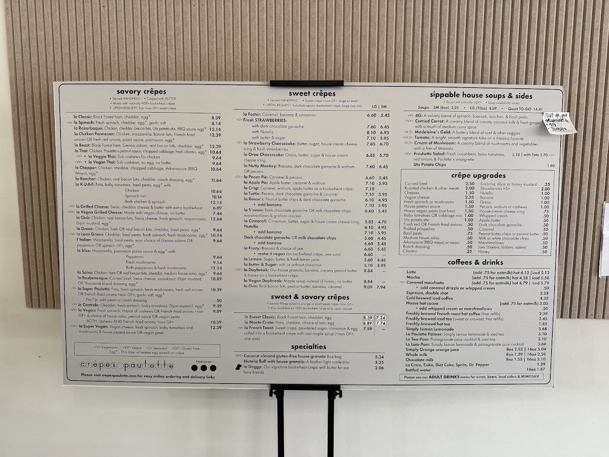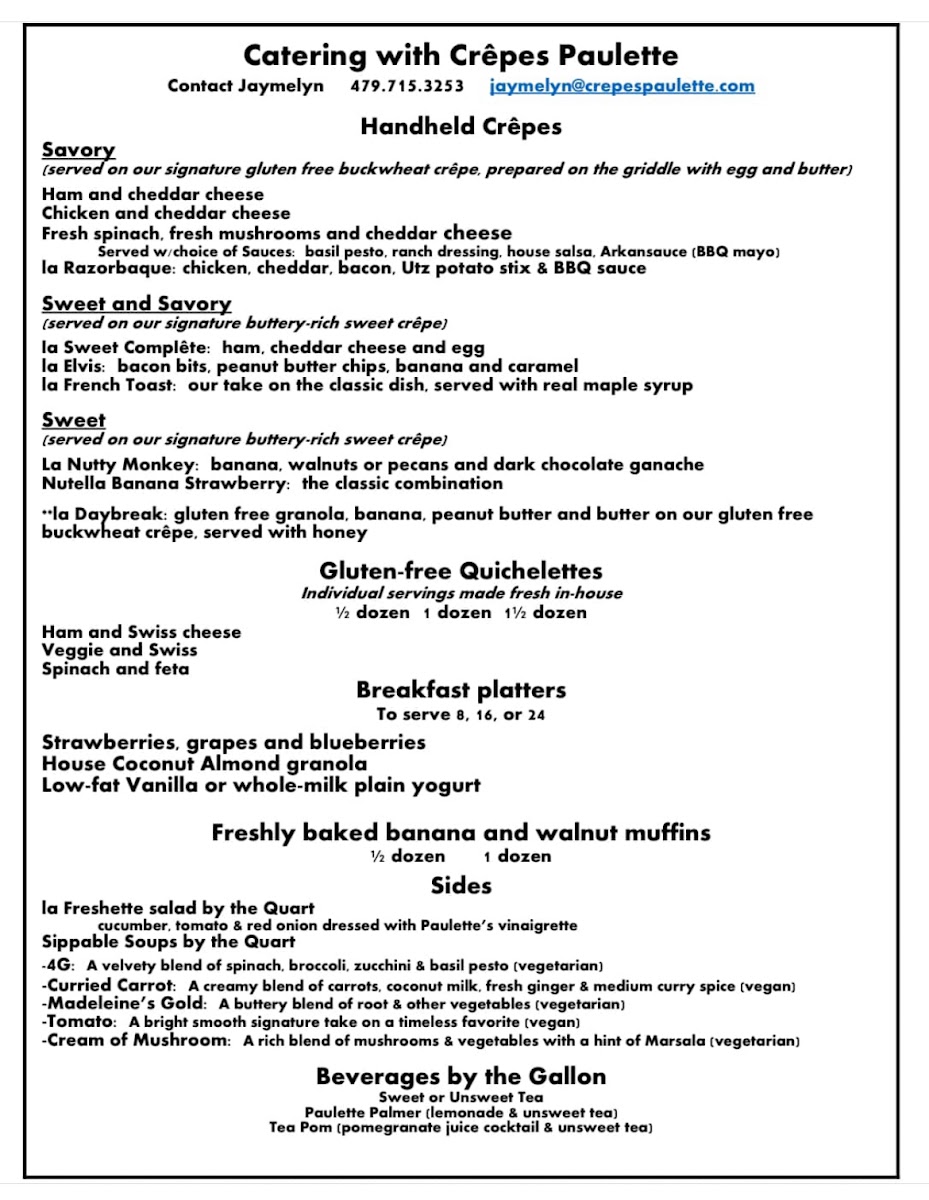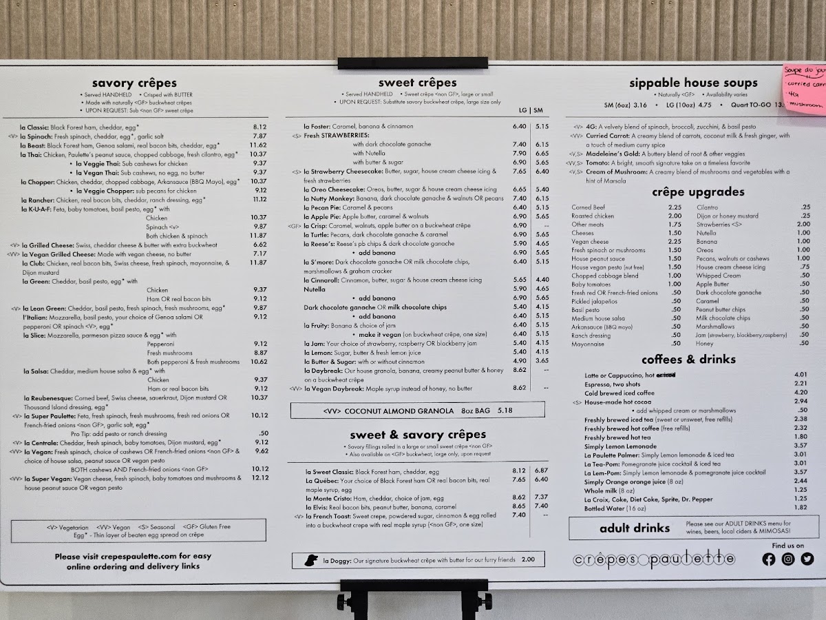 Overall, the menu at Crêpes Paulette offers a charming and diverse selection that balances both indulgence and creativity, even without listed prices. The savory options like la Classic, la Spinach, la Razorback, la Chicken Parmesan, and la Beast provide hearty, satisfying choices, while the sweet side shines with treats such as la Foster, Fresh STRAWBERRIES with dark chocolate ganache, Fresh STRAWBERRIES with Nutella, Fresh STRAWBERRIES with butter & sugar, and la Strawberry Cheesecake, each promising a delightful dessert experience. The fusion of flavors continues with the sweet & savory crêpes like la Sweet Classic, la Monte Cristo, and la French Toast, which add a playful twist to traditional offerings. Beyond crêpes, specialties like Coconut almond gluten-free house granola, Nutella fluff with house granola, and even la Doggy round out the menu with unique flair. Complementing everything are comforting sippable soups and sides such as 4G, Curried Carrot, Madeleine's Gold, Tomato, and Cream of Mushroom, making the overall menu feel thoughtfully curated and appealing for a wide range of tastes.